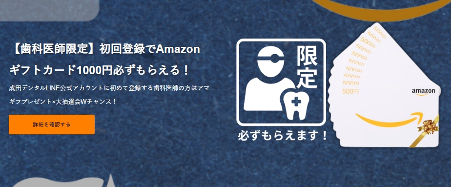 初めて成田デンタルLINE公式アカウントにご登録いただく歯科医師様限定! Amazonギフトカード1,000円分をもれなくプレゼントいたします!